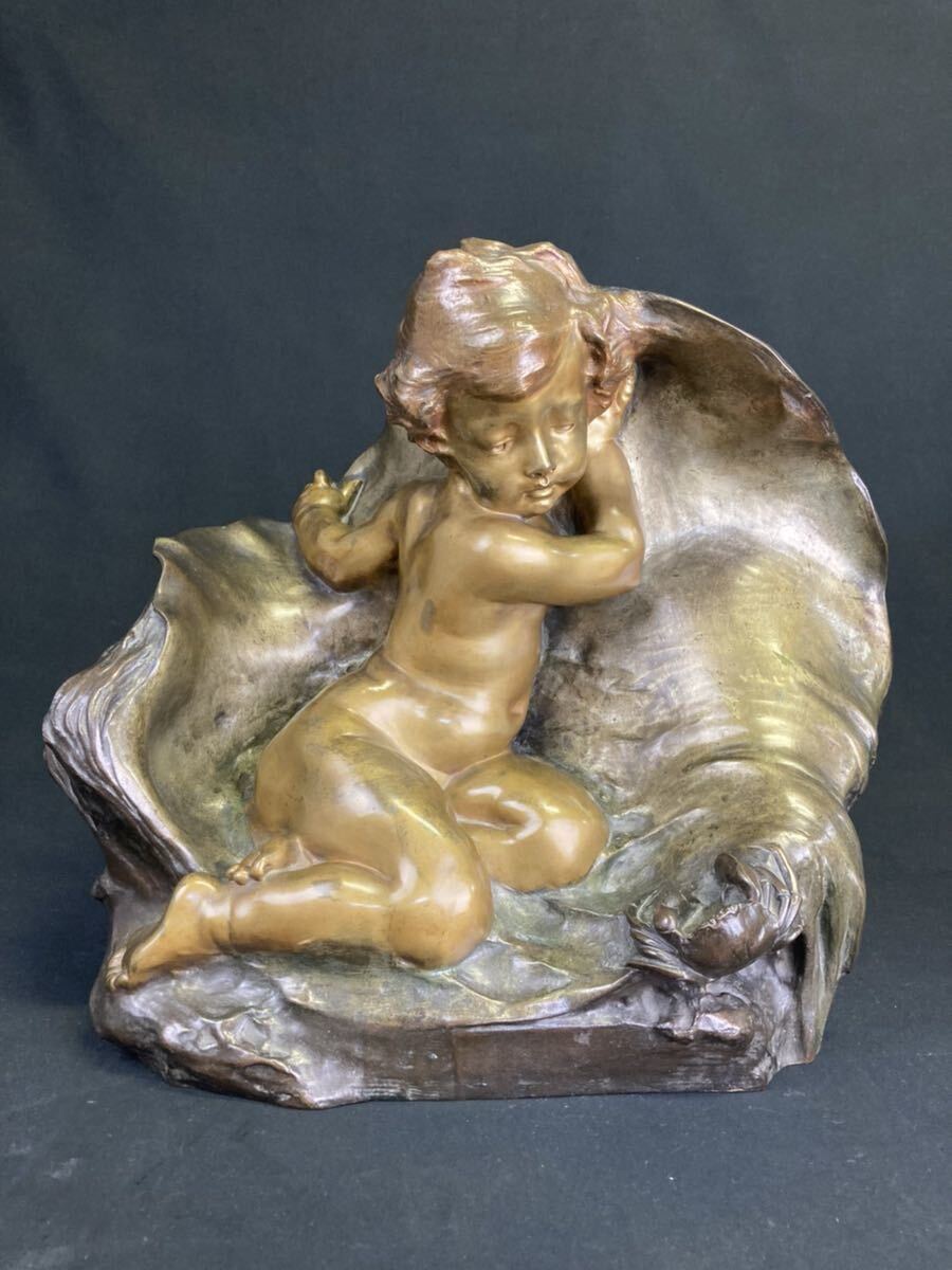 > 【A1864】 ブロンズ像 Henri Pernot / A putto in a shell Bronze statue アンリ・ペルノ「シェルのプット」希少 西洋彫刻 オブジェ 美術品