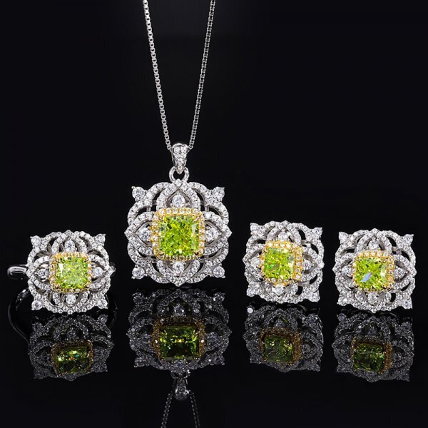 オリーブグリーントルマリンジュエリーセット(ネックレス、リング、ピアス)、925シルバー