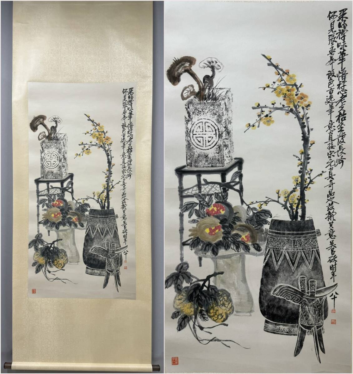 - 古美術 掛け軸 中国・近現代 「呉昌碩書」 紙本 【清供図】 立軸 書道 巻き物 肉筆保証 唐物 古画 画心135x67cm LT-2412270
