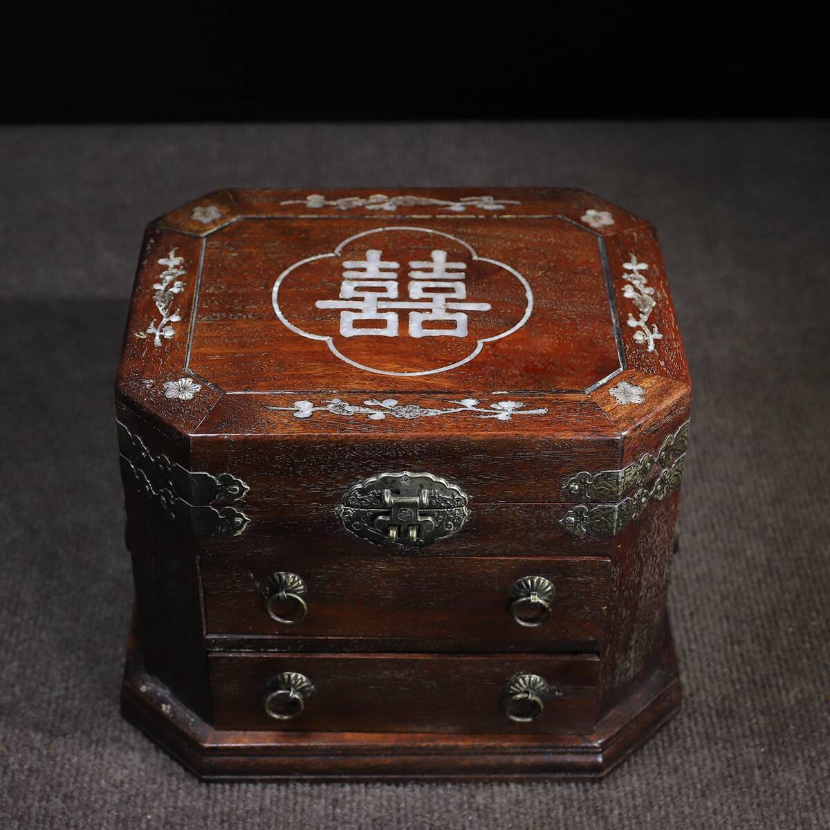 - 旧蔵 清 花梨木 八角 首飾盒 多寶盒 はめ込む貝殼 木製 極細工 中国古玩 古美術 古美味 骨董品 201-02