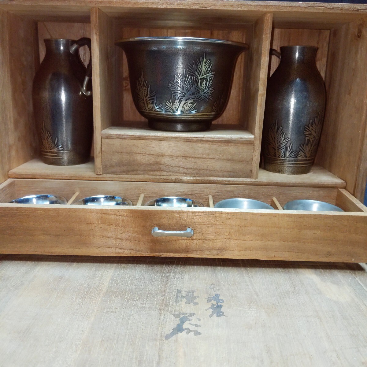- 327 錫製 酒器 本錫 徳利 おちょこ 茶(酒)こぼし? 木箱入り 8点セット