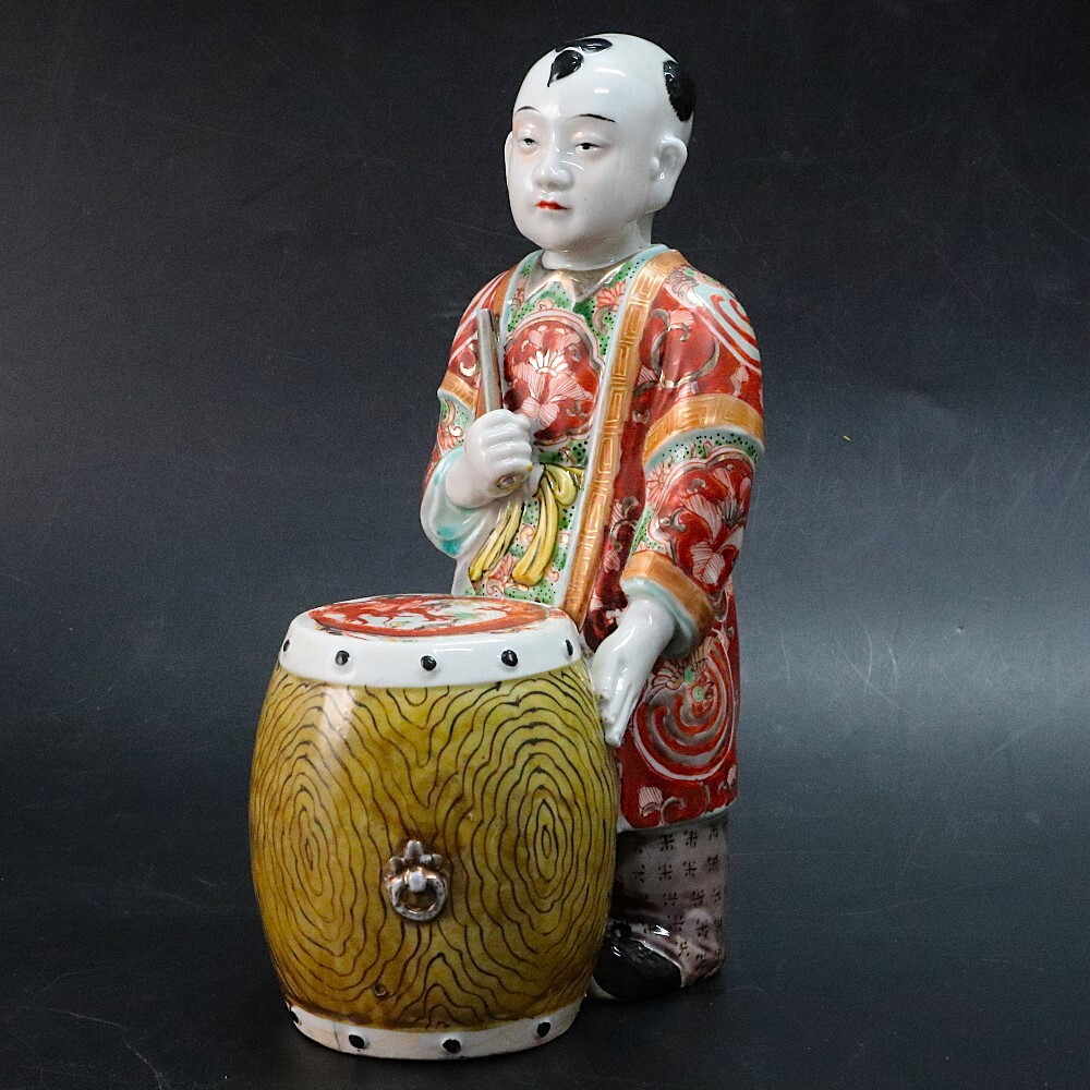 - ◆◇時代 九谷焼 色絵金彩太鼓打唐子童子陶器製人形 置物 フィギュリン 太鼓童子 アンティーク 骨董◇◆