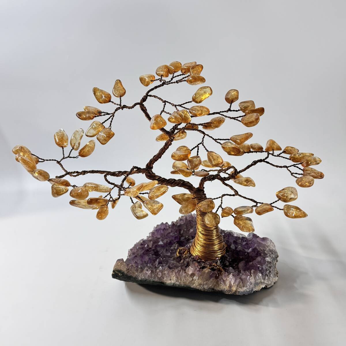 - 【62078Q】アメジスト 琥珀 アンバー アメジストの原石を台座とした琥珀の実がなる木のオブジェ 2.77kg 原石 天然石 鑑賞石 コレクション品