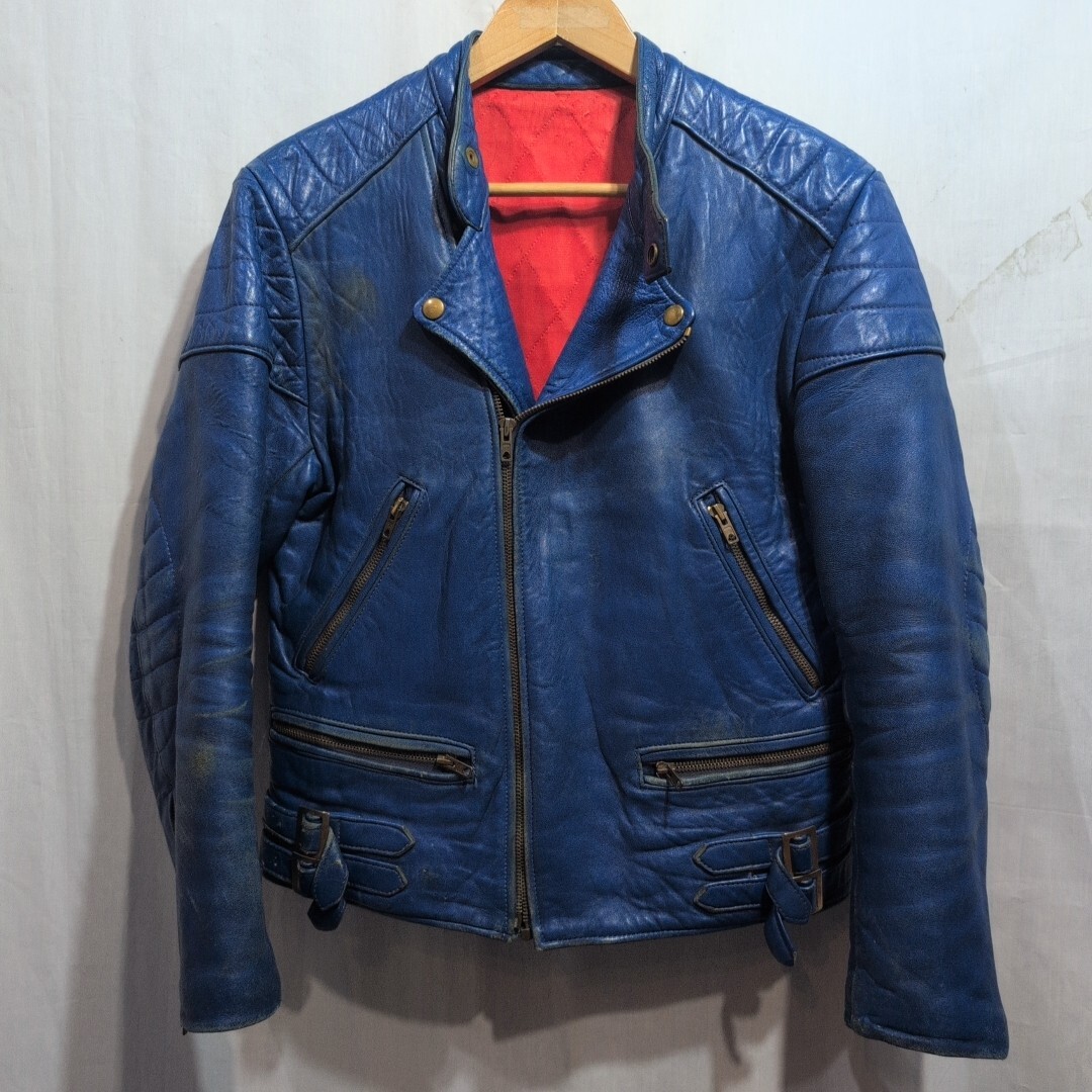 - 70s Vintage フランス製 シープスキン ライダースジャケット M相当 セミダブル レザージャケット 青 70年代 ビンテージ ルイス/666/Shott