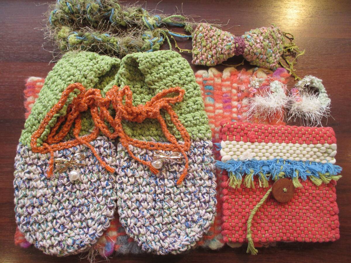 > アヴリル☆AVRIL☆糸☆ハンドメイド作品☆ピアス☆スリッパ☆手織り☆ネックレス ☆ブローチ☆キット☆完成品まとめ売り☆ブローチ☆ポーチ