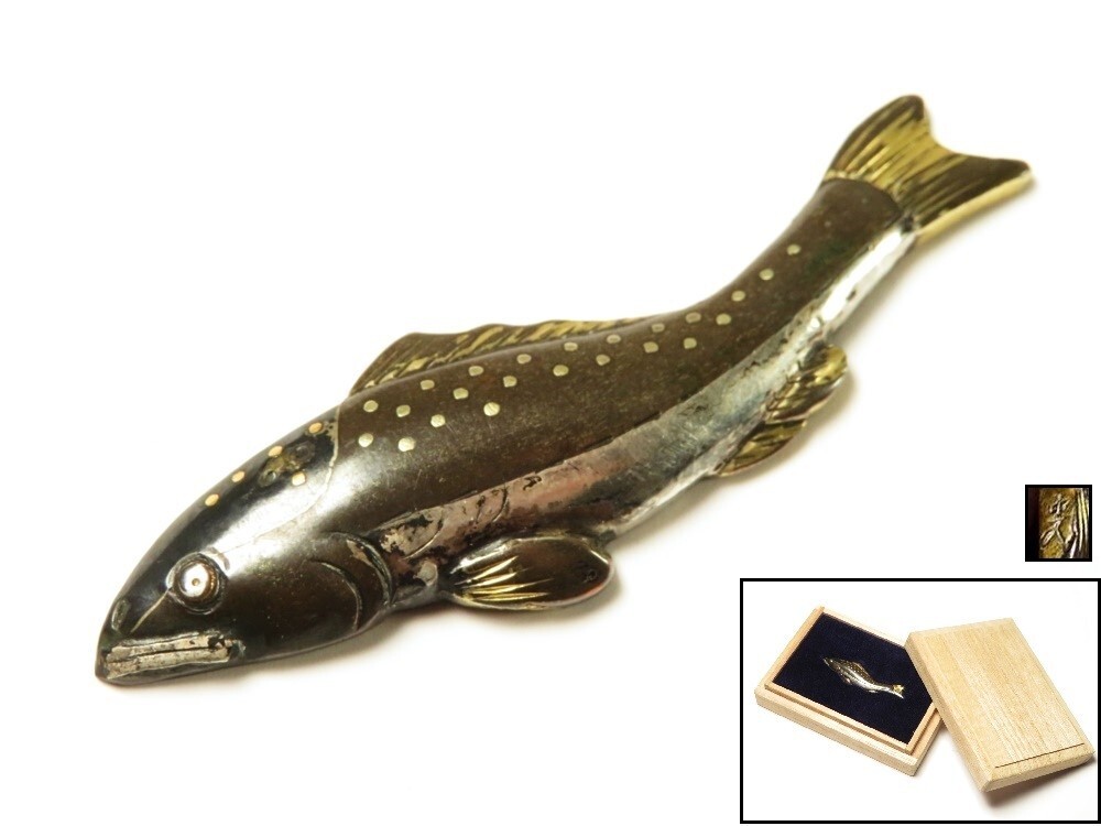 - 【9414】和装小物 (明治・大正・昭和) 在銘 四分一銀 鮎 金具(初品・買取品)