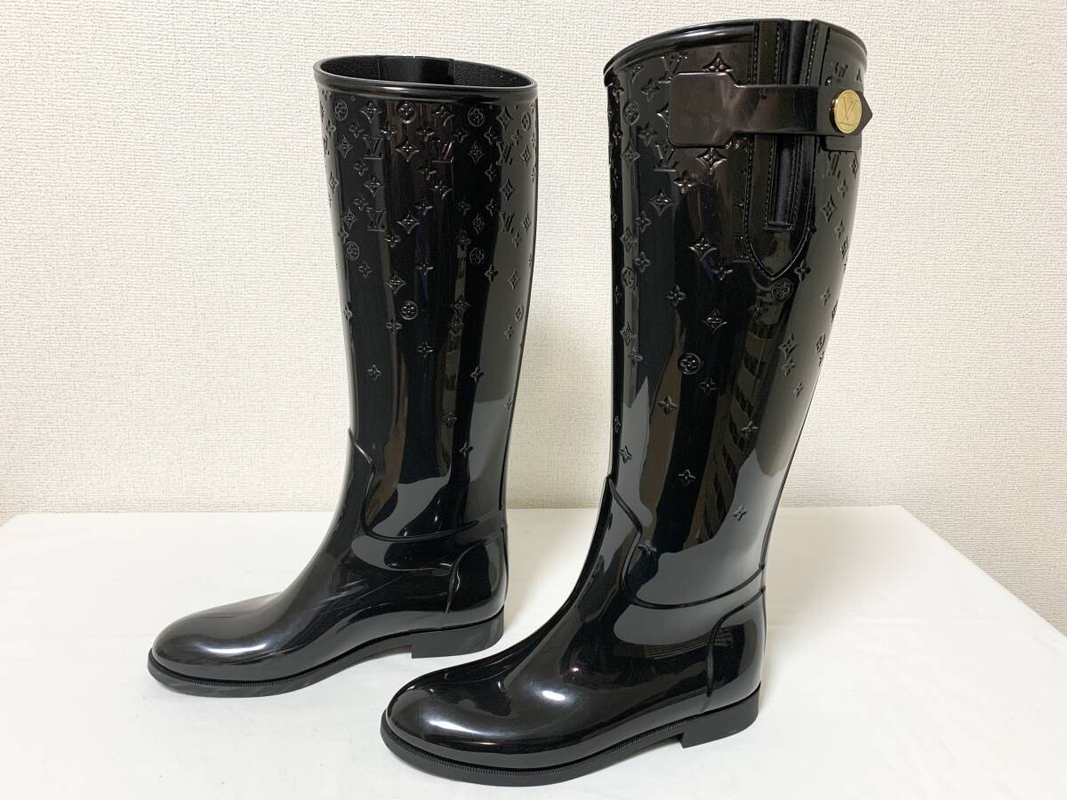 > 希少 美品 ルイ ヴィトン LOUIS VUITTON ドロップス ライン モノグラム ラバー LV金具 ロング レイン ブーツ レディース シューズ 靴 35 黒