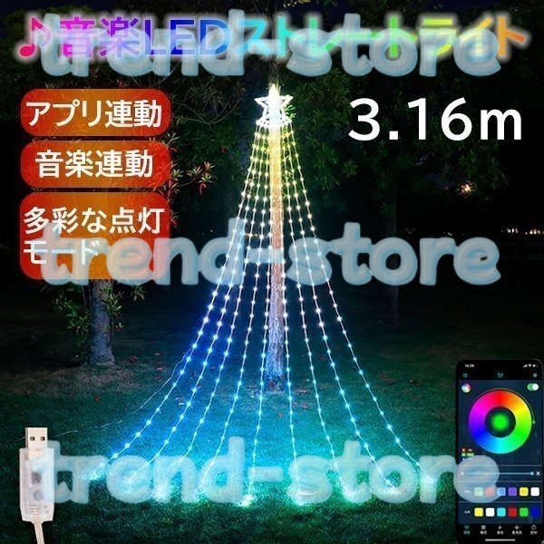> イルミネーション 屋外用 ドレープライト クリスマスツリー APP連動 音楽連動 LED 3.16m 多彩なパターン 9本 USB式 省エネルギー 防水