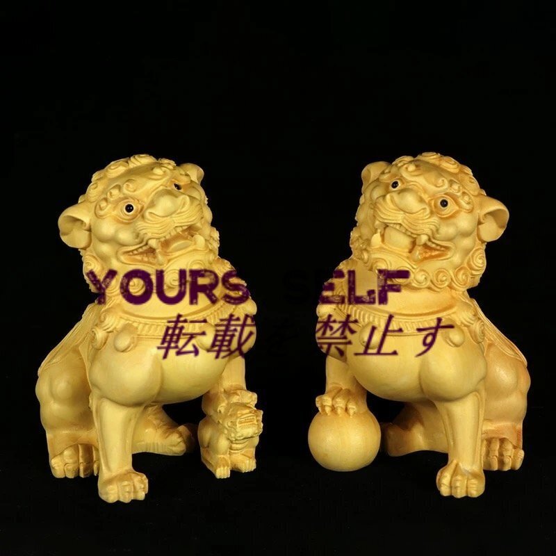 - 一式 獅子 置物 ライオン 緑起物 飾り置物 木彫 祈る 招福 精密彫刻 工芸品 美術品