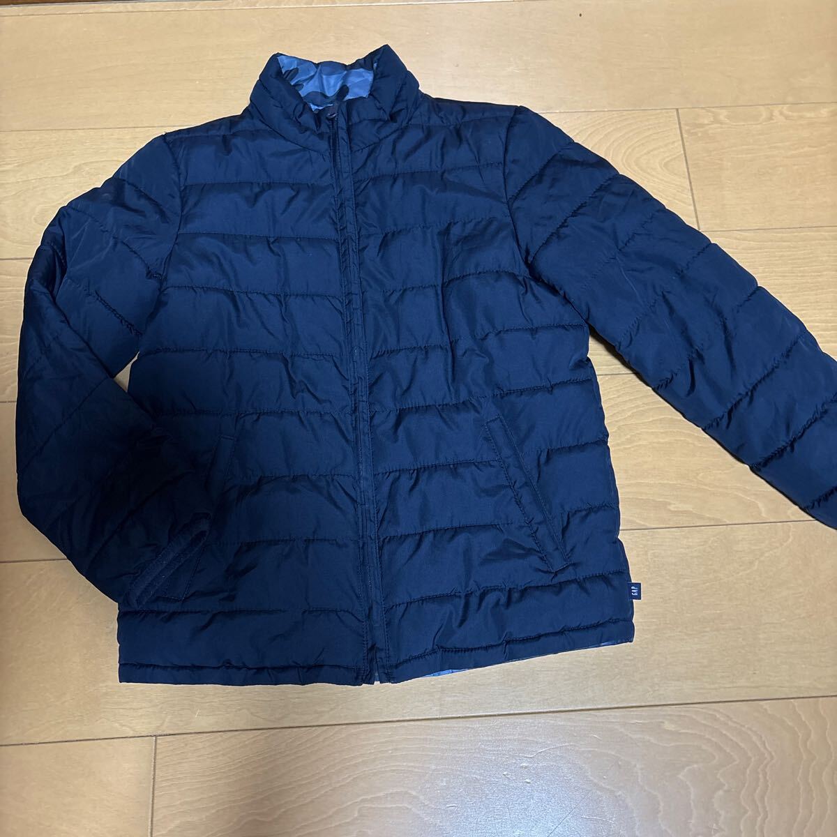 > ワンシーズン着用GAPkids紺色&迷彩柄2wayリバーシブル ダウンジャケットサイズ130ポケットあり ネイビー