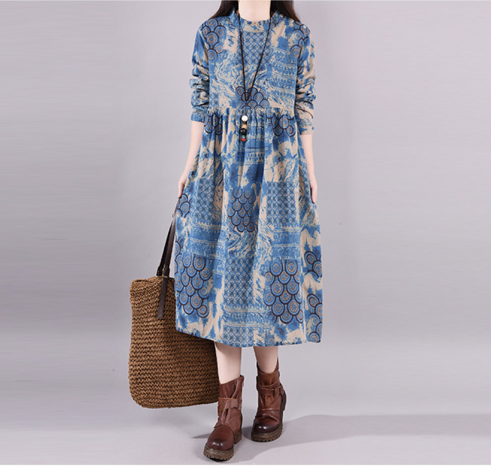 - 【新品】ワンピース 長袖 エスニック風 プリント 体型カバー ミモレ丈 フリーサイズ