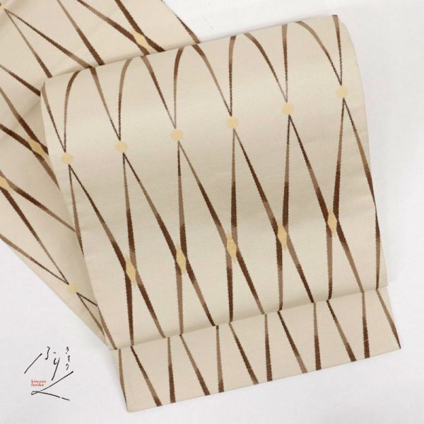 - 【袋帯】 シンプル斜め格子繋菱模様 クリーム色 六通柄 正絹着物 FY12-8