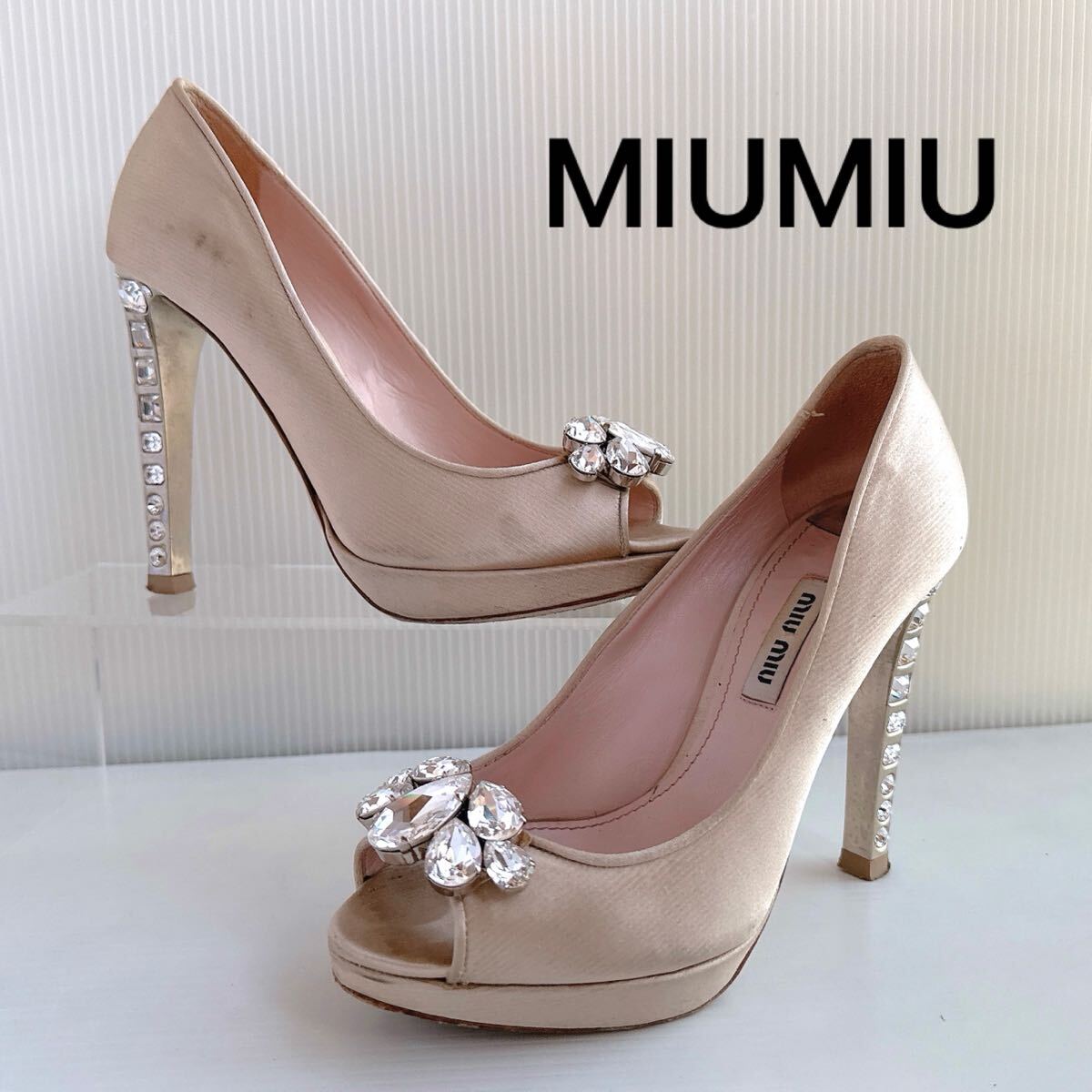- ミュウミュウ クリスタル ビジュー ハイヒール サンダル パンプス オープントゥ MIUMIU 靴 イタリア製 サテン ゴールド 35.5