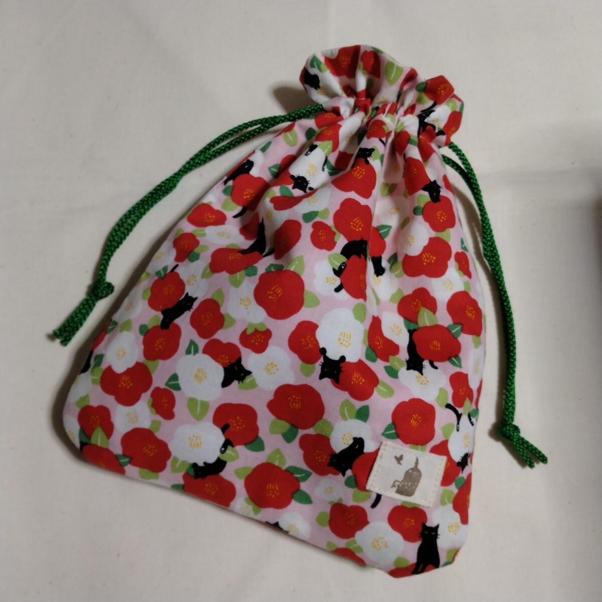 - ★ハンドメイド★巾着★和柄♪椿と黒猫♪化粧ポーチ