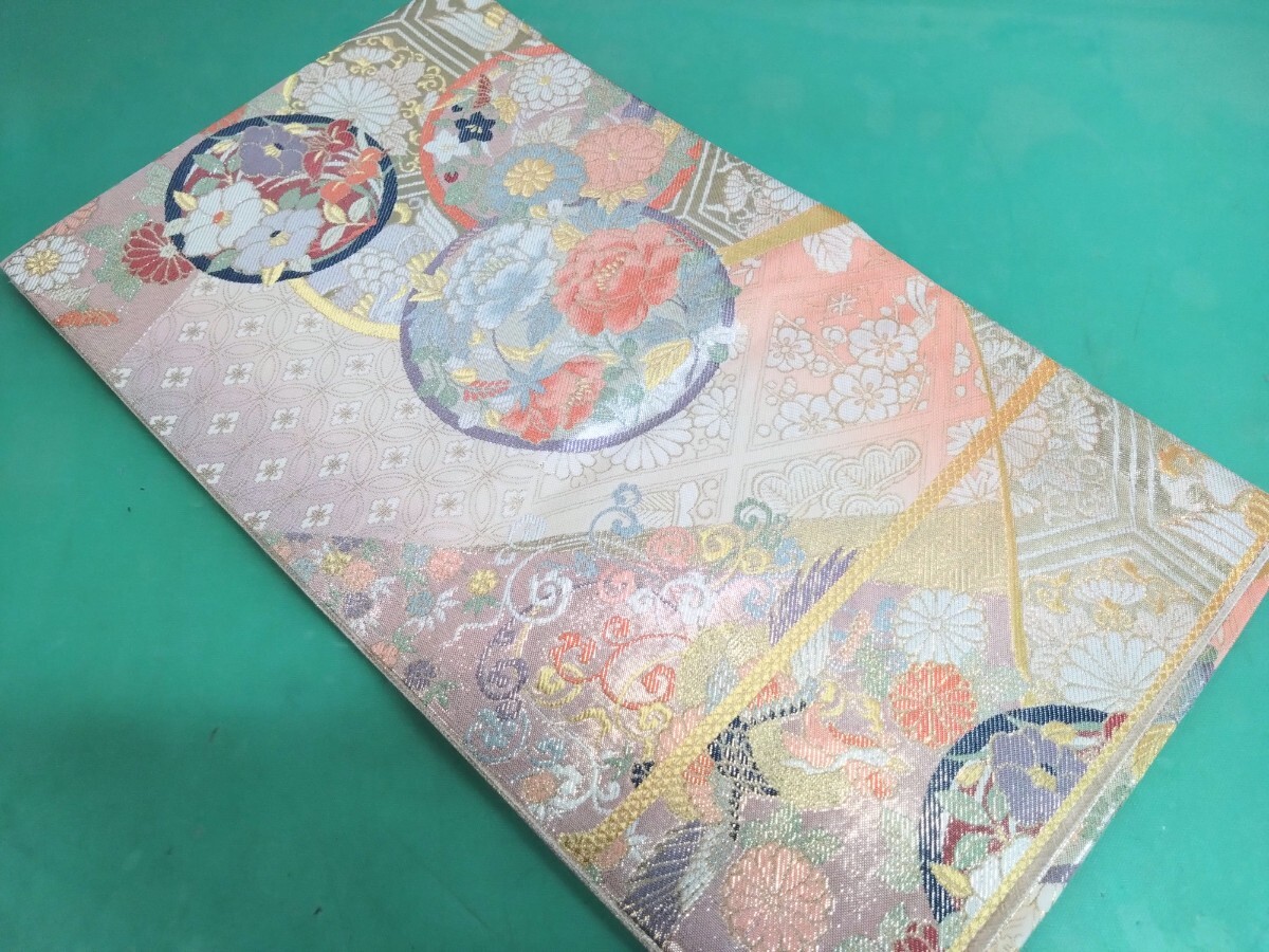 > ●18 高級 袋帯【裂取花の丸 佐賀錦 】花鳥 華紋 鳳凰 牡丹 菊 菖蒲 椿 金糸 金彩 桃色 ピンク正絹 豪華絢爛 六通 帯 縁起物 美品 ④