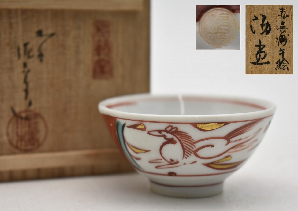> 竜F864◆九谷焼 松籟窯 松雲堂 四代 松本佐吉 赤呉須 午絵 酒器 酒盃 干支盃 ぐい呑み 共箱 懐石道具 検:煎茶道具 茶杯