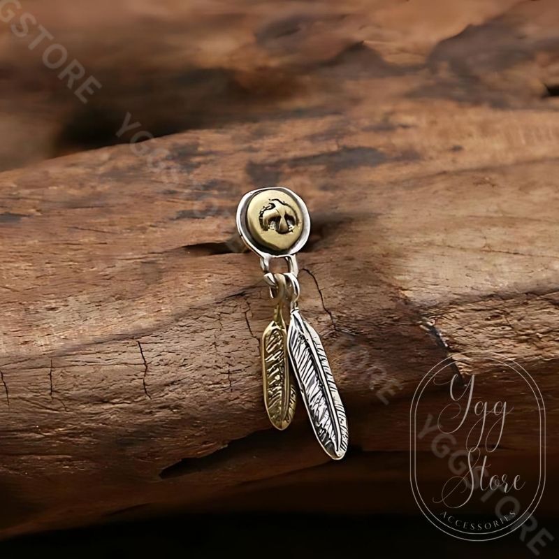 - 2フェザー付き ピアス 金 銀 ゴールド×シルバー925 ネイティブ イーグル刻印 シングル 1個売り メンズ レディース 男女兼用 アクセサリー