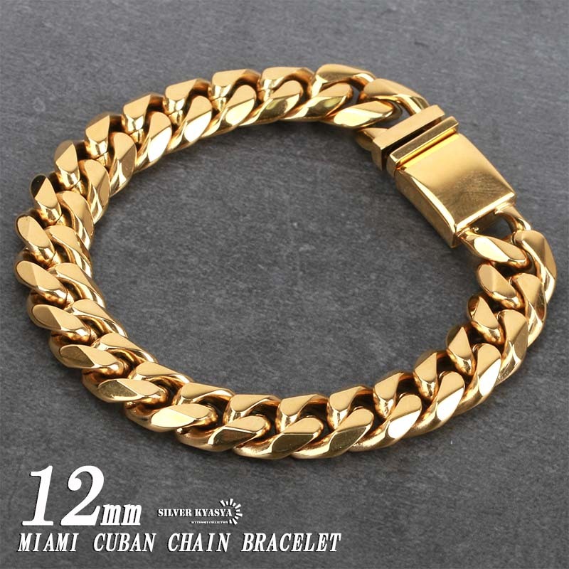 - 幅12mm STEEL 6面カット 喜平ブレスレット ステンレス 金 差し込み式 喜平チェーンブレスレット