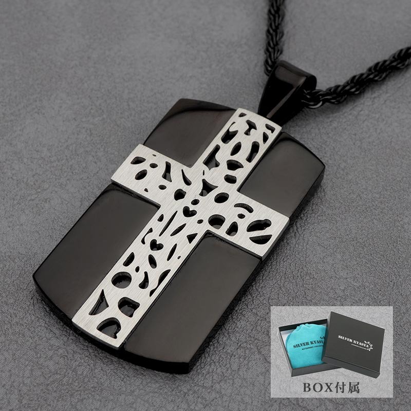 - 幾何学 クロス模様 ブラック ドッグタグネックレス 黒 メンズネックレス プレートネックレス ロープチェーン付き 専用BOX付属