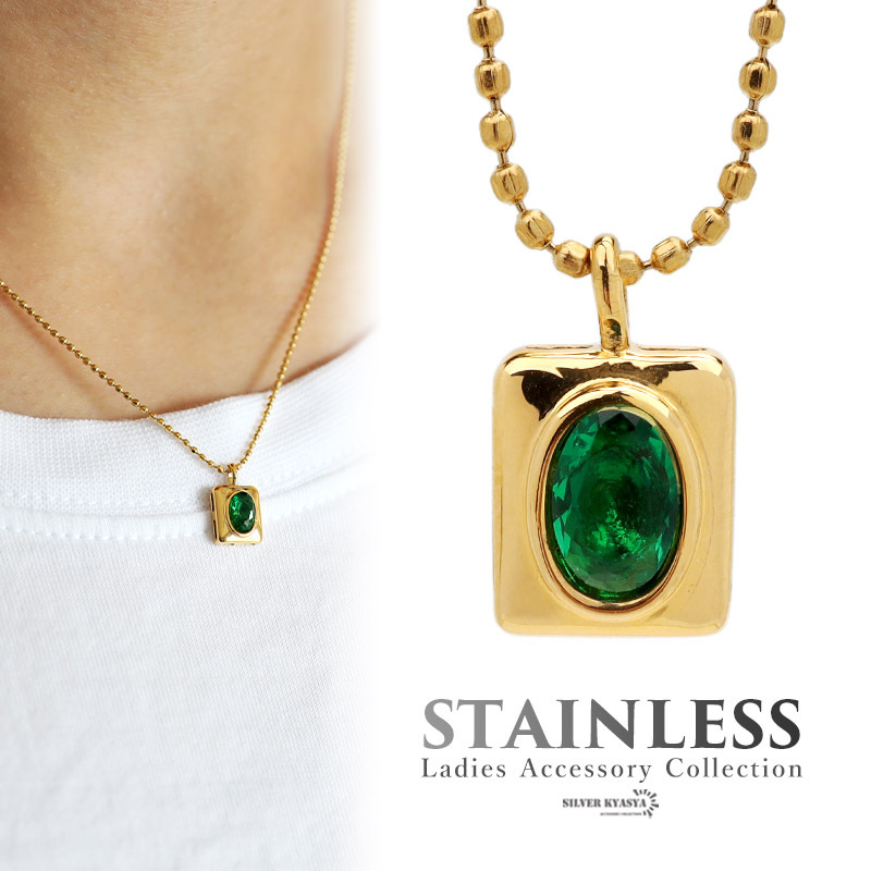 - ネックレス ステンレス 金属アレルギー レディース グリーン 緑 一粒ネックレス 18KGP ボールチェーン 細身 ゴールド