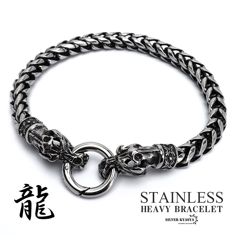 > ステンレス ドラゴンブレスレット 龍 シルバー ヘビーブレスレット ごつめ フランコチェーン 燻し風 男性 メンズ 金アレ対応