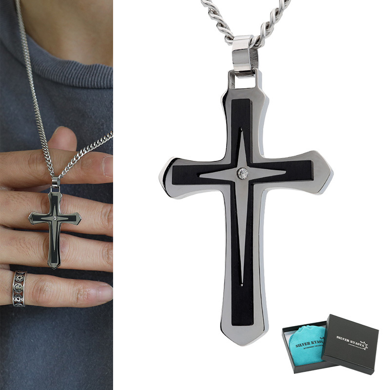 - シンプル クロスネックレス シルバー ブラック 黒 メンズネックレス ステンレス クロス 喜平チェーン付き 専用BOX付属