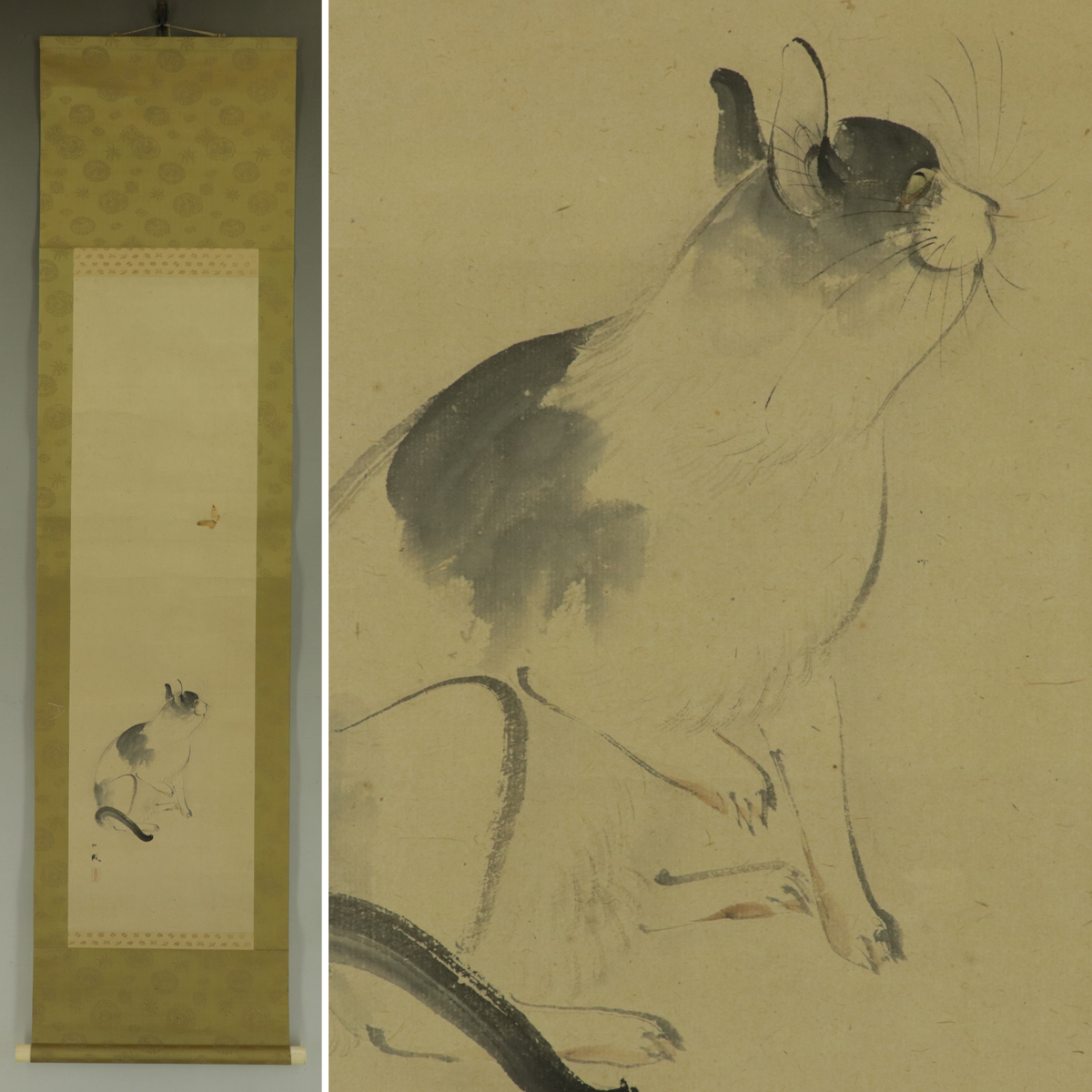 - 【模写】武部白鳳【猫に蝶】◆紙本◆合箱◆掛軸 u09211