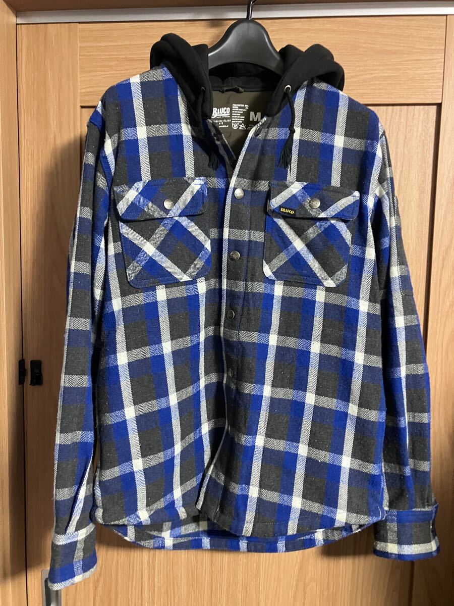 > 秋 ☆ クーポン BLUCO ブルコ パーカー フード付きシャツ チェック M ジャケット チェック ジャケット ネルシャツ