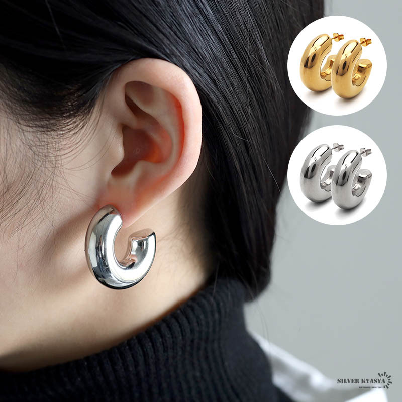 - (シルバー) フープピアス 太め ステンレス ピアス イヤリング gold 2点セット 太幅 両耳用