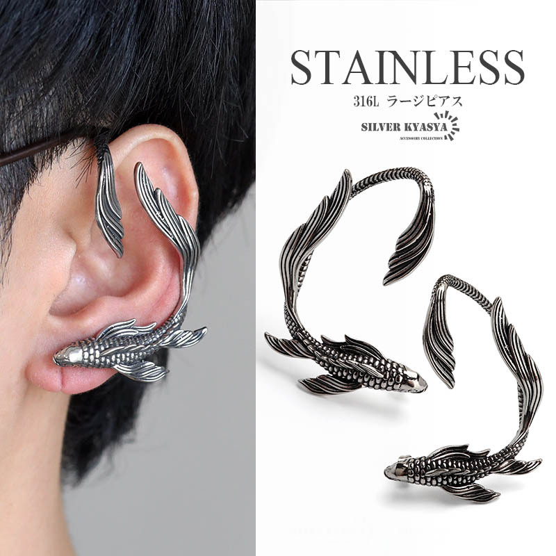 - (右耳用) サージカルステンレス316L 鯉 ピアス 大きめ フィッシュピアス イヤーカフ シルバー 金属アレルギーフリー 片耳