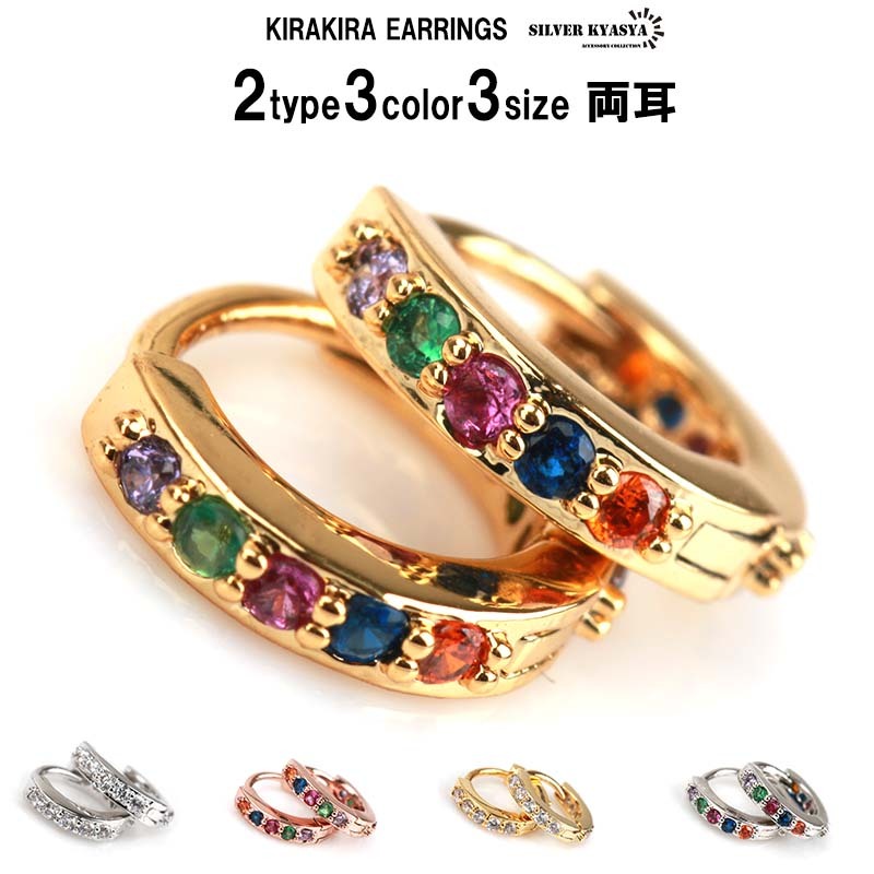 > (ゴールド&カラフルストーン、外径14ミリ) 2点 小ぶり ピアス フープピアス ストーン カラフルピアス シルバーピアス 両耳