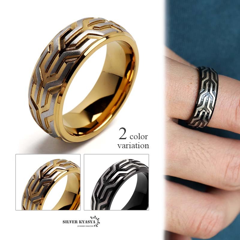 - (ゴールド、17号) メンズリング ゴールド ブラック 男性 指輪 シンプルリング 付けっぱなしOK ステンレス製 タイヤ模様