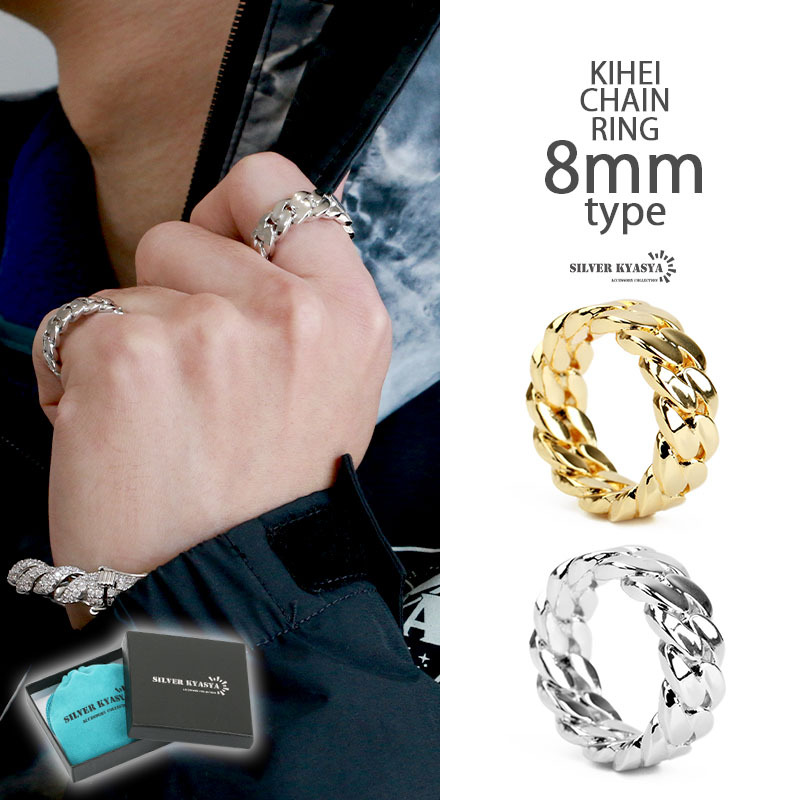 - (ゴールド、14号) 8mm 喜平チェーンリング 18K GP シンプル 指輪 ゴールド シルバー ダンス 専用BOX付属