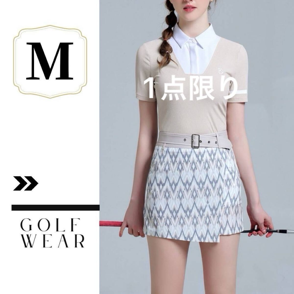 - ゴルフウェア 上下セット M ポロシャツ ミニスカート 重ね着風 ベルト付