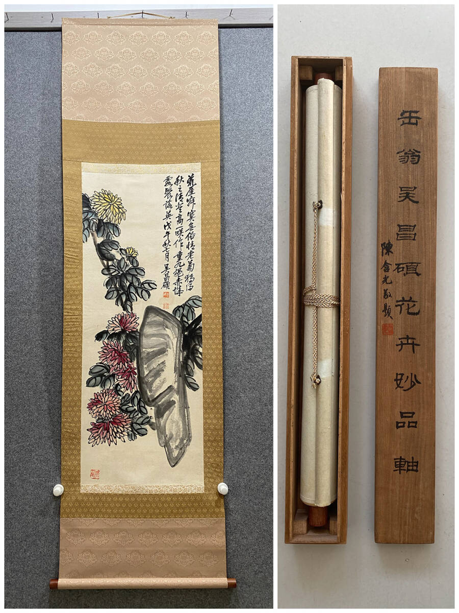 > 古美術 掛け軸 中国・近現代 「呉昌碩書」 紙本 【菊石図】 立軸 書道 巻き物 肉筆保証 唐物 古画 画心101x40cm LT-250233