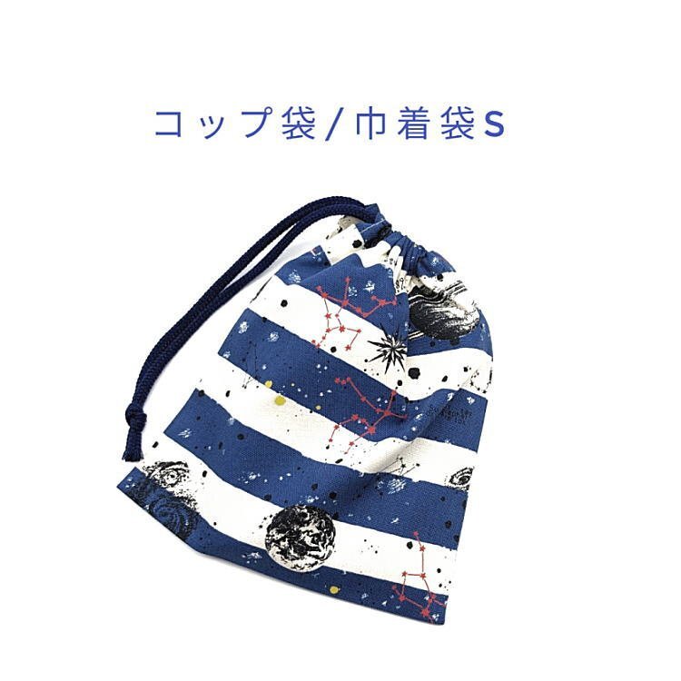 > コップ袋・巾着袋S【宇宙ボーダー柄 ネイビー】マチ無し ランチ袋 ナフキン入れ ポーチ 給食袋 キッズ 男の子 星 銀河 惑星 地球 月