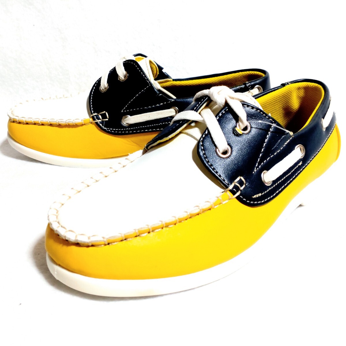 - 超特価/未使用【サイズ=21.0cm】ノーブランド/ボーイズ/合皮/デッキシューズ/yellow×white×navy