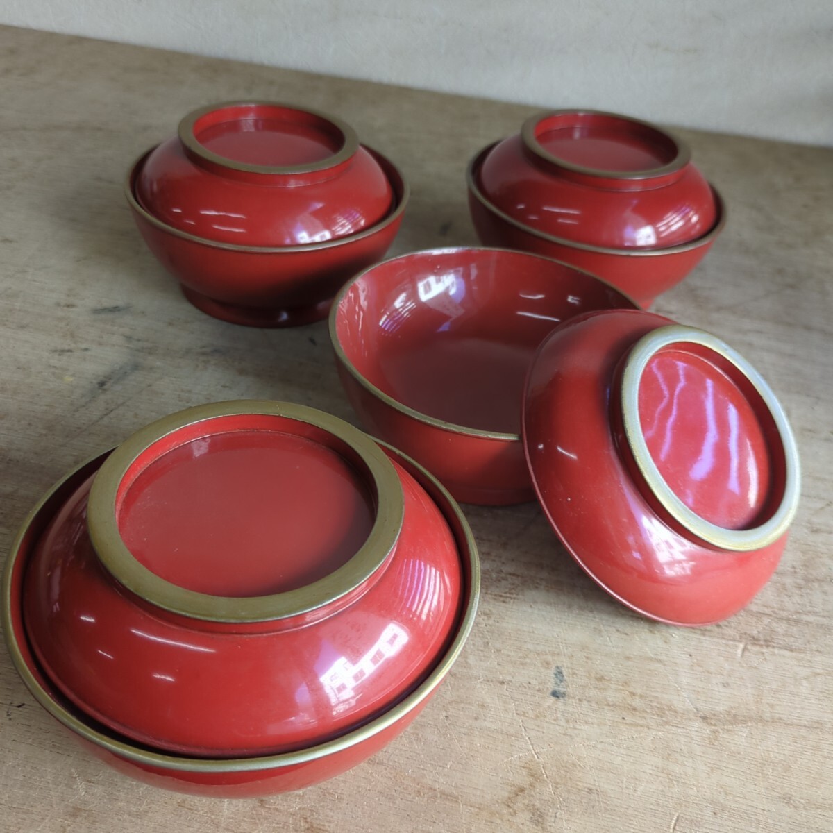 - 菓子椀 木製漆器 金縁 朱塗 吸物椀 木製 お椀 アンティーク 骨董 4つ