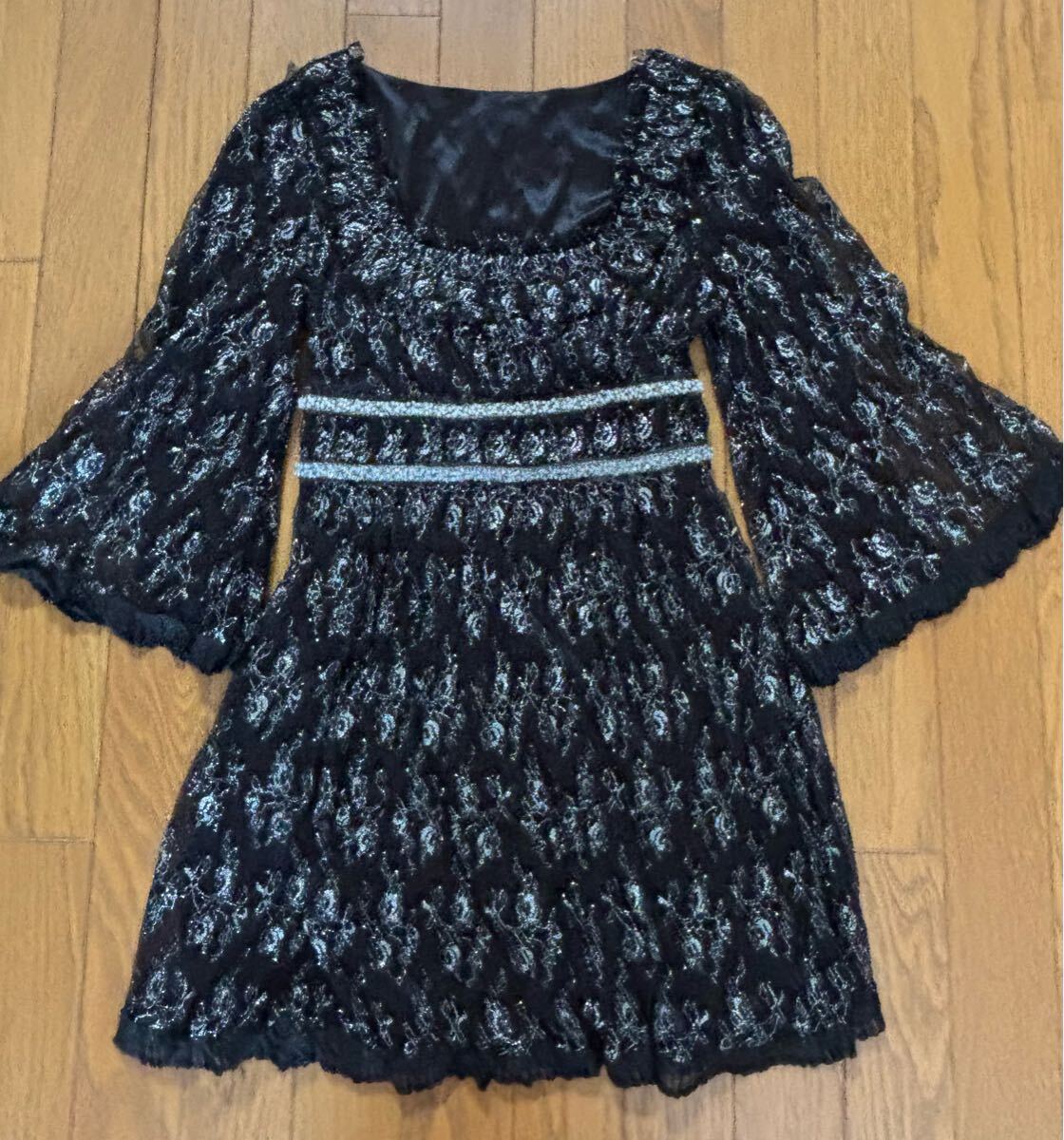> Rojita 七分袖トップス、チュニック、黒地、銀ラメいっぱいのレース、裏地付き(身頃も袖も)、華やか、韓国製、(株)ロジータ、used、美品