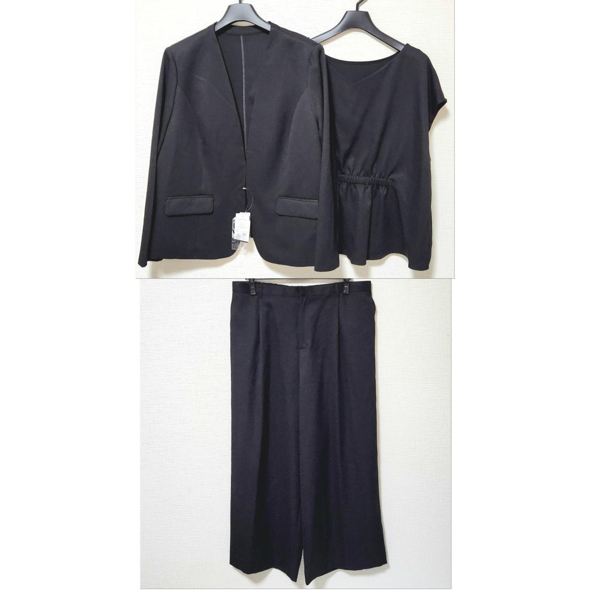 > 【IN-1691】レディース スーツ 大きいサイズ 3点セット ノーカラージャケット ウエストギャザーブラウス セミワイドパンツ 4L ブラック