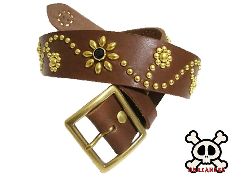 - 真鍮製バックル 栃木レザー フラワー型スタッズベルト チョコ(ブラックスポッツ)40mm幅 一枚革
