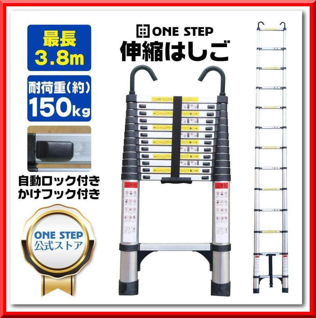 - 【新品】伸縮 はしご 3.8m 耐荷重150kg アルミ フック付き スライド式 軽量