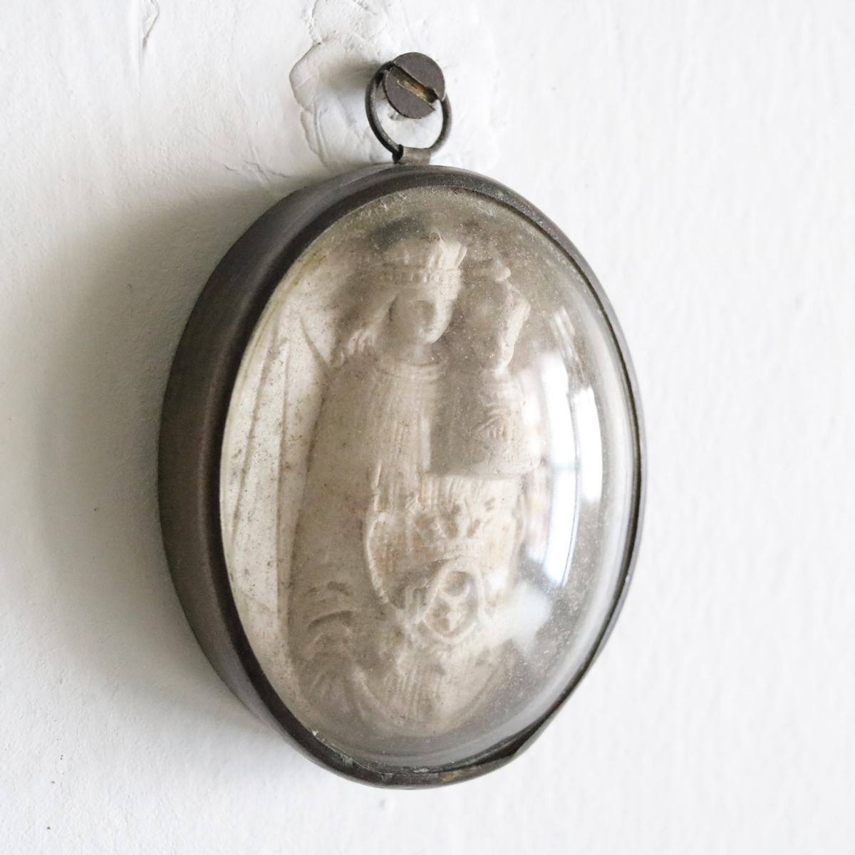 > 19世紀 1800年代 ガラスドーム 聖母マリア 教会 キリスト マリア フランスアンティーク 聖品 クロス 十字架 メダイ メシャム オーバル 彫刻