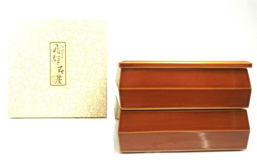 > 伝統工芸品 飛騨春慶 春慶塗り 菊紋入り二段重 亀甲重 本木漆器 ヒバ(黄春慶) 天然木 重箱 箱付き 1990年代 KEN512