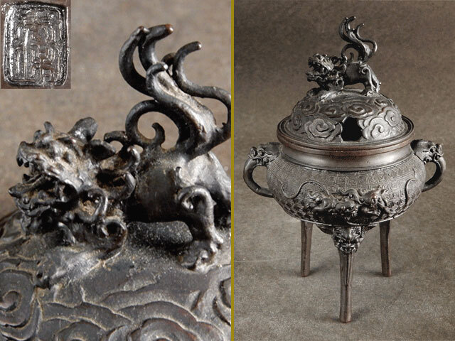 - 米田 秀保 銅 細密細工 獅子摘み 三足 香炉