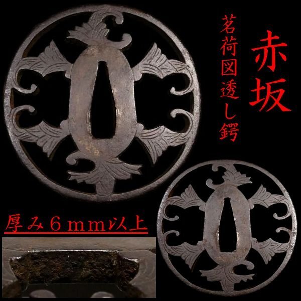 > 【 恵 #1537 】 赤坂の名作を彷彿とさせる一品 茗荷図透かし 鉄地鍔 厚み 6mm以上 検:鍔/縁頭/切羽/ハバキ/刀剣/刀装具