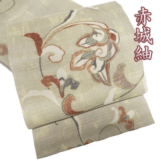 > 特選 袋帯 中古 リサイクル 正絹 カジュアル 仕立て上がり 全通 青柳 創柳庵 赤城紬 ラベル付き 花模様 枯草色 多色 きもの北條 A1150-9