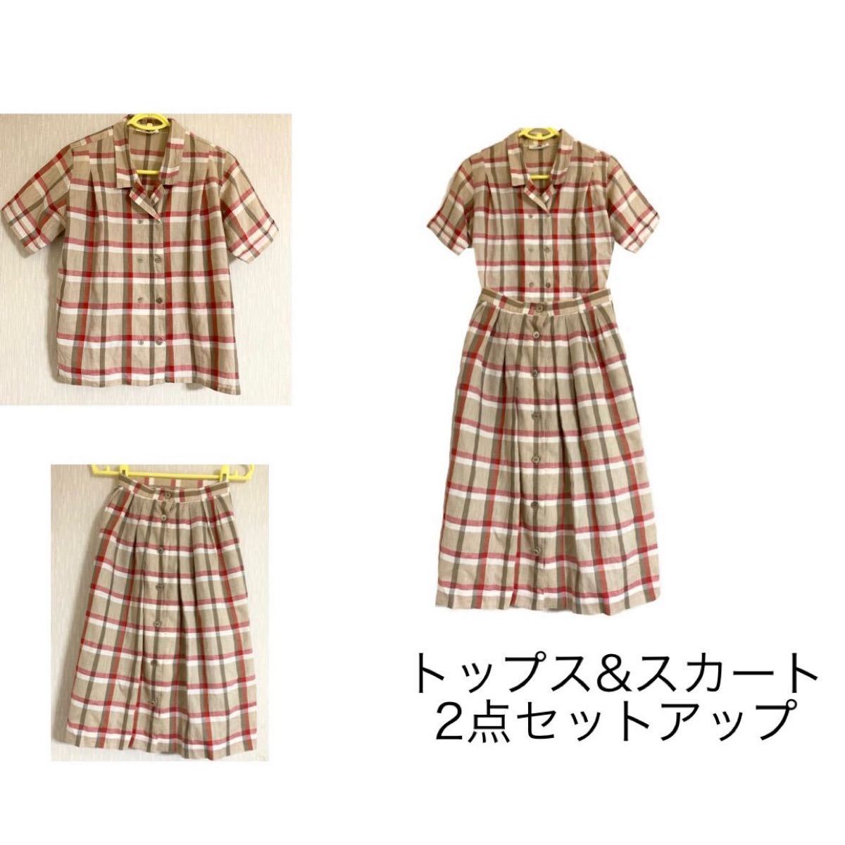 - 匿名配送 チェック柄セットアップ 綿麻ひざ下スカート 半袖ブラウス タックスカート アンサンブル 半袖シャツ ベージュ 赤 ワンピース