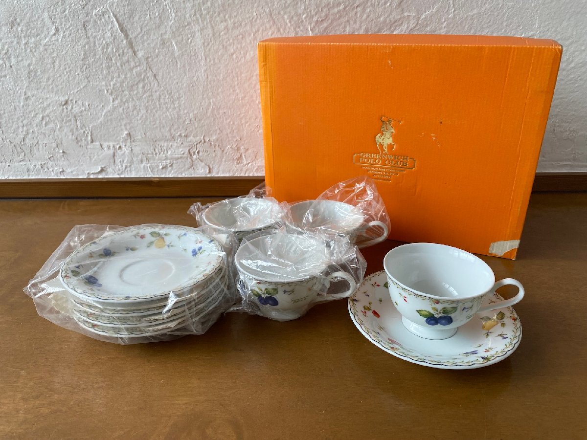 > 【未使用品】GREENWICH POLO CLUB☆フルーツシンフォニー 4客 コーヒーセット☆カップ&ソーサー☆コーヒーカップ☆金彩☆