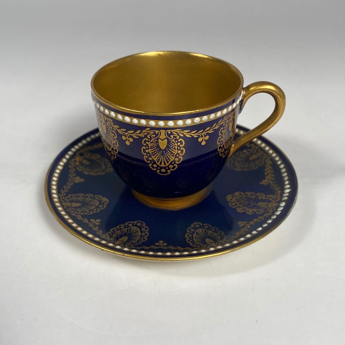 - 19世紀 アンティーク ロイヤルウースター 金彩 ジュエル装飾 デミタスカップ 金盛り ブルー カップ ソーサー コーヒーカップ 瑠璃金彩